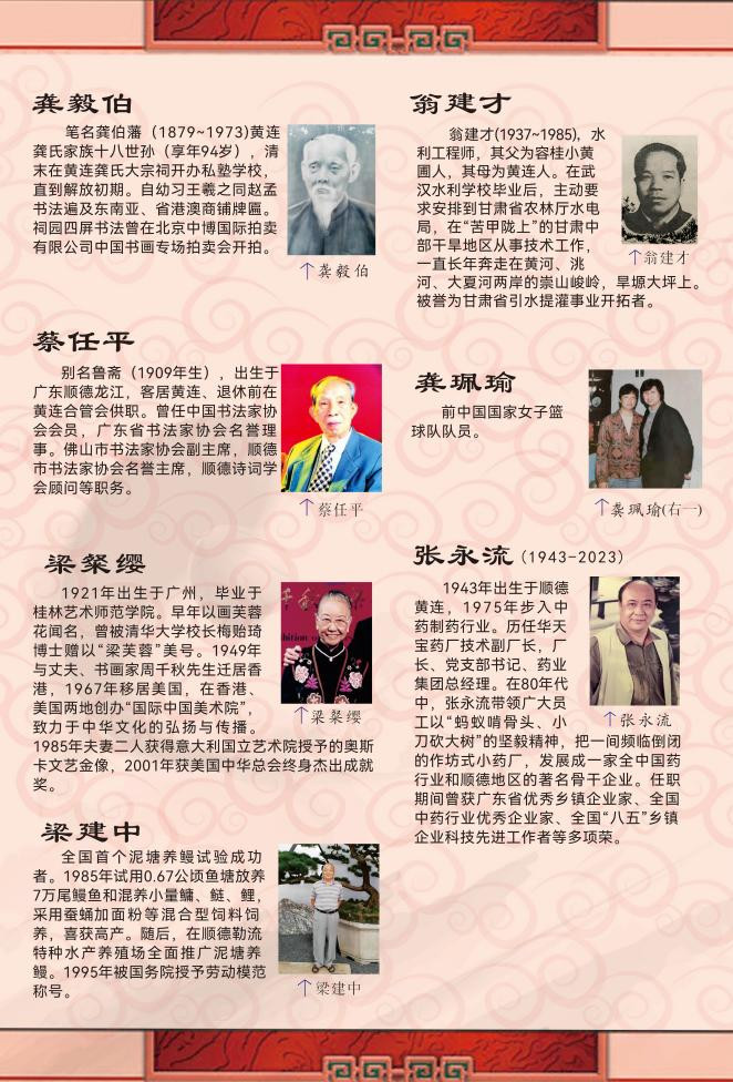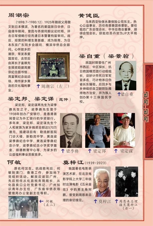 梁定邦、梁定谋:梁定邦、梁定谋两先生为梁季彝先生之子。梁季彝先生曾于1938年创办广安银行,是香港首间登记为外汇银行的华资银行。多年来,梁定邦、梁定谋先生个人和家族为家乡捐资总额达570多万港元,捐建项目有:勒流新医院门诊大楼、新勒流中学、黄连梁季彝纪念中学、黄连梁季彝纪念小学、梁季彝纪念小学奖学基金、顺德体育中心等,为家乡的公益福利事业贡献良多。