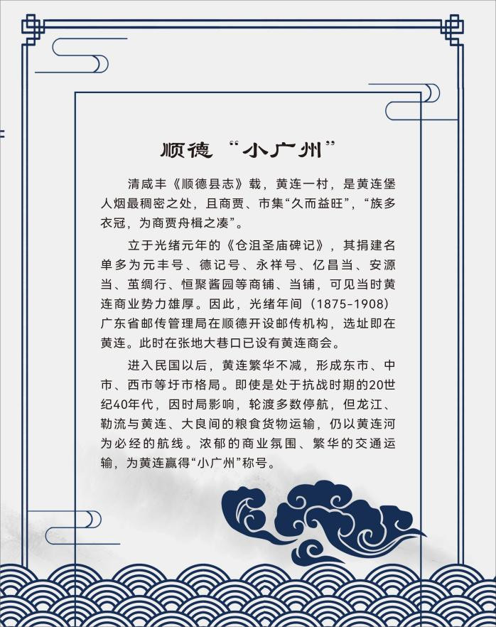 立于光绪元年的《仓沮圣庙碑记》,其捐建名单多为元丰号、德记号、永祥号、亿昌当、安源当、茧绸行、恒聚酱园等商铺、当铺,可见当时黄连商业势力雄厚。因此,光绪年间(1875-1908)广东省邮传管理局在顺德开设邮传机构,选址即在黄连。此时在张地大巷口已设有黄连商会。