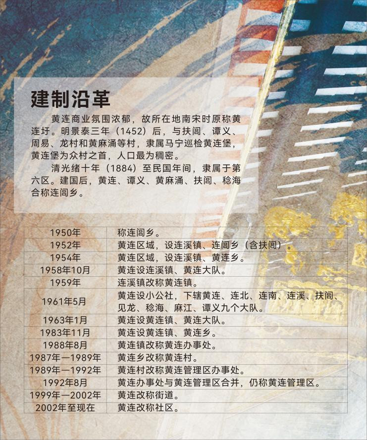 清光绪十年(1884)至民国年间,隶属于第六区。新中国成立后,黄连、谭义、黄麻涌、扶闾、稔海合称连闾乡。
