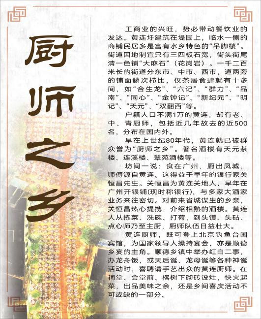 早在上世纪80年代,黄连就已被群众誉为“厨师之乡”。著名酒楼有天元茶楼、连溪楼、翠苑酒楼等。