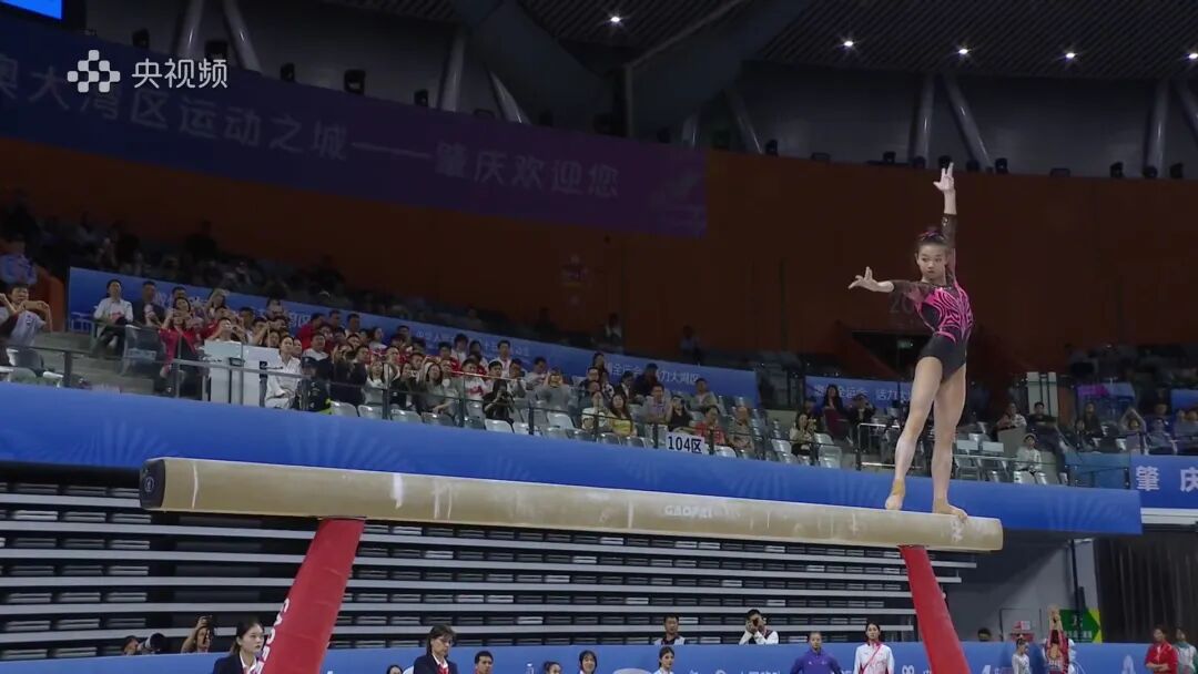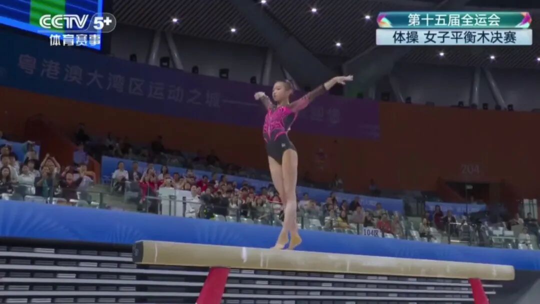 柯沁沁在平衡木比赛中(多重曝光) 图/羊城晚报