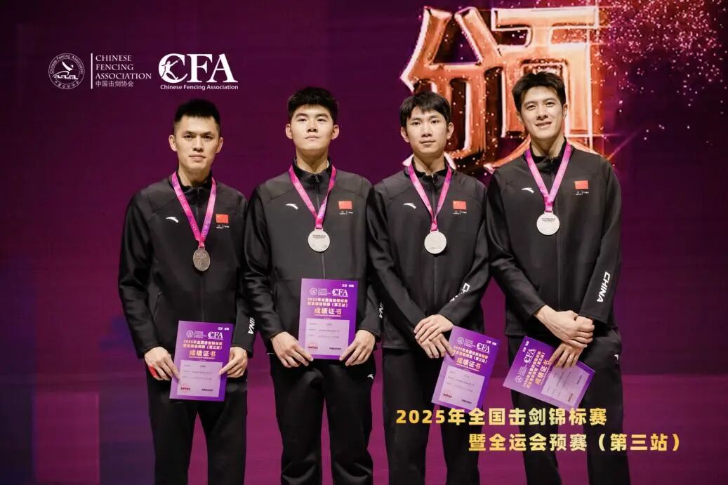 十四运会男子佩剑团体金牌得主邓小浩、许英明、梁建豪携手年轻队员官泽文出战男子佩剑团体赛,最终成功斩获男子佩剑团体银牌,顺利晋级全运会决赛阶段。