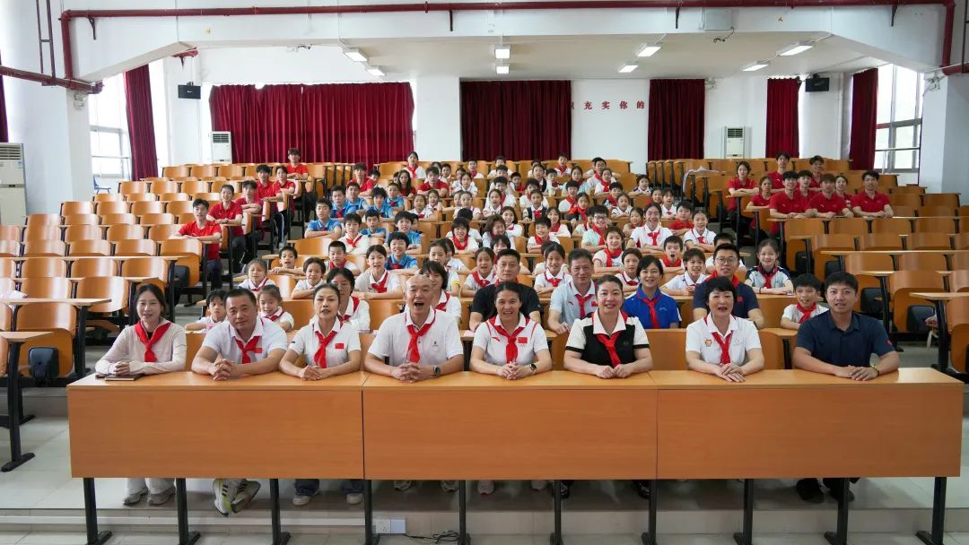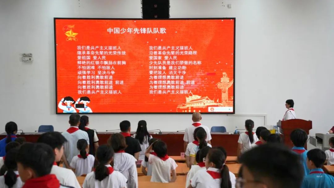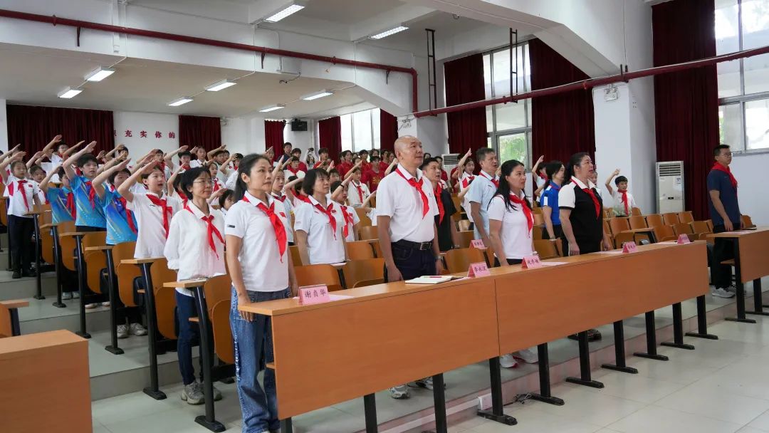 “我们是共产主义接班人,继承革命先辈的光荣传统!”全体少先队员齐声高唱《中国少年先锋队歌》,嘹亮的歌声传递着新时代少年的志气与担当。在教务处党支部书记钟国勤的带领下,队员们高举右拳,重温入队誓词,一字一句,掷地有声,红领巾与团旗交相辉映,象征着红色基因代代相传。