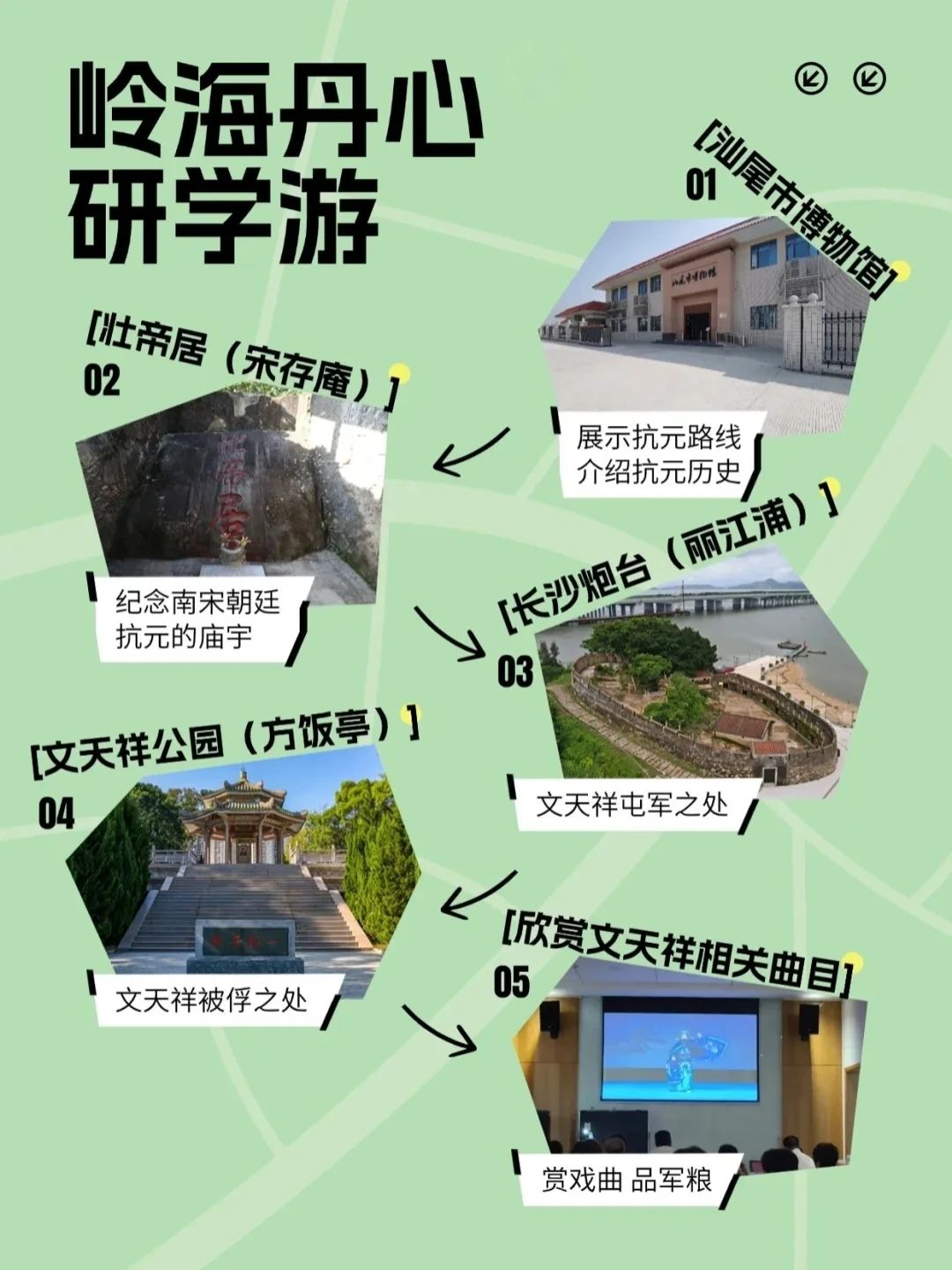 “岭海丹心”研学游,围绕文天祥、宋帝海陆丰抗元路线开展研学旅游,是一趟回溯南宋风云的旅程。南宋景炎年间,宋室南渡,文天祥等抗元志士在海陆丰留下诸多遗迹。研学之旅从汕尾市博物馆启程,随后前往宋存庵,观“壮帝居”刻石,感受宋帝及文天祥抗元岁月。接着抵达长沙炮台,领略其险要。在文天祥公园,体悟文天祥的浩然正气。还设有研学课堂,让学子品军粮、饮擂茶、赏戏曲,沉浸式感受那段激昂历史,传承爱国精神。
