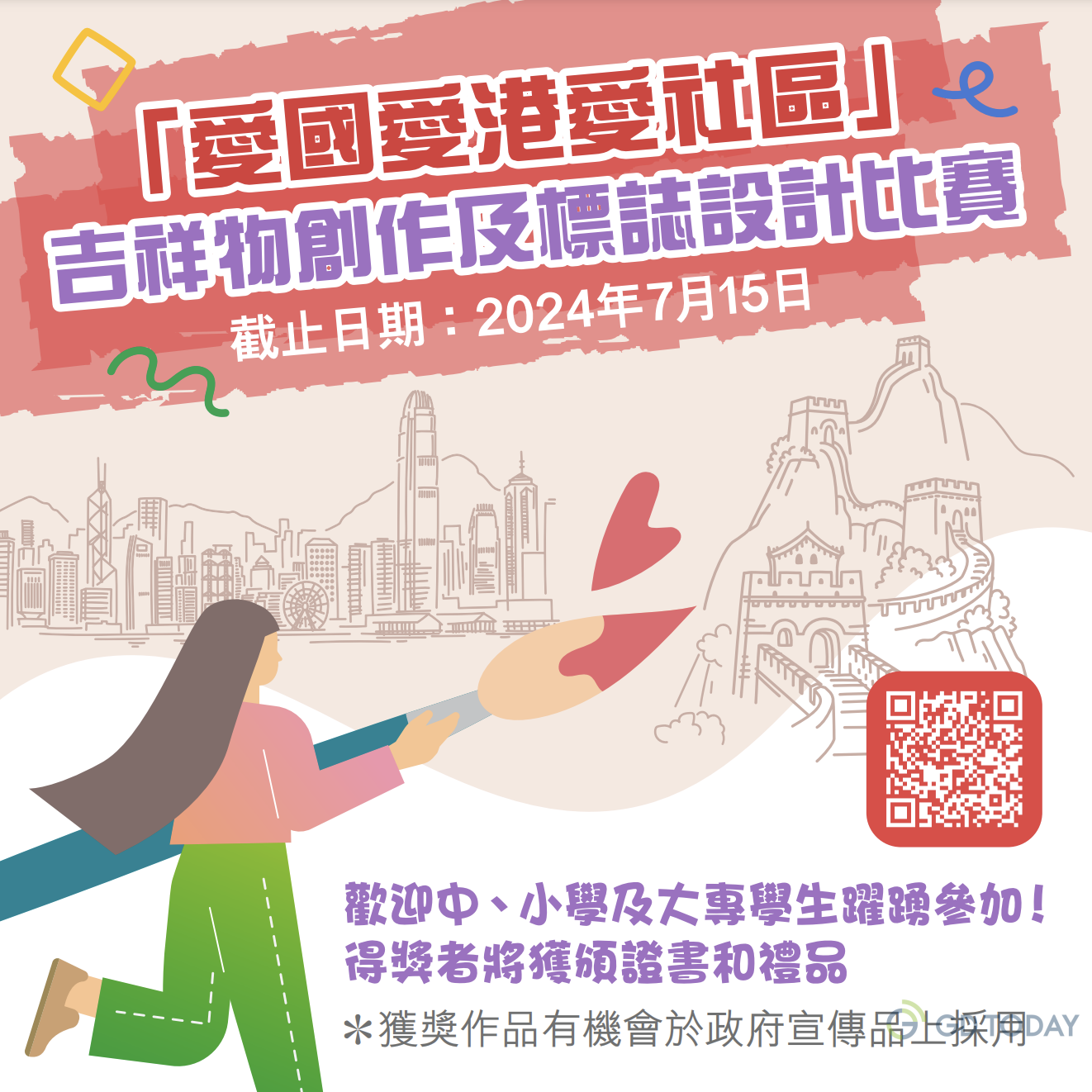据悉,“爱国爱港爱社区”吉祥物创作及标志设计比赛由“爱国主义教育工作小组”主办、香港大公文汇传媒集团承办。吉祥物创作及标志设计这两个比赛类别各设小学组、中学组和大专组,参赛者可参加多于一个比赛类别,但每人就每个比赛类别只可递交一份参赛作品。