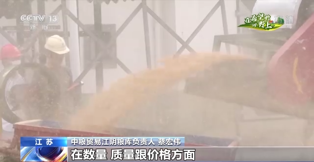 中粮贸易江阴粮库负责人 蔡宏伟:今年的夏粮收购在数量、质量跟价格方面呈现三高,小麦质量好,亩产跟往年比也有相应的增加。