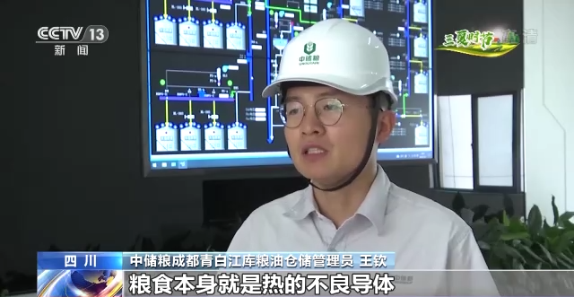 中储粮成都青白江库粮油仓储管理员 王钦:粮食本身就是热的不良导体,通过使用氮气和准低温储粮技术,使仓内全年的平均粮温变化幅度控制在6—8℃,这种情况下害虫就不繁殖,失去活力,也不再吃我们的粮食了。