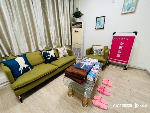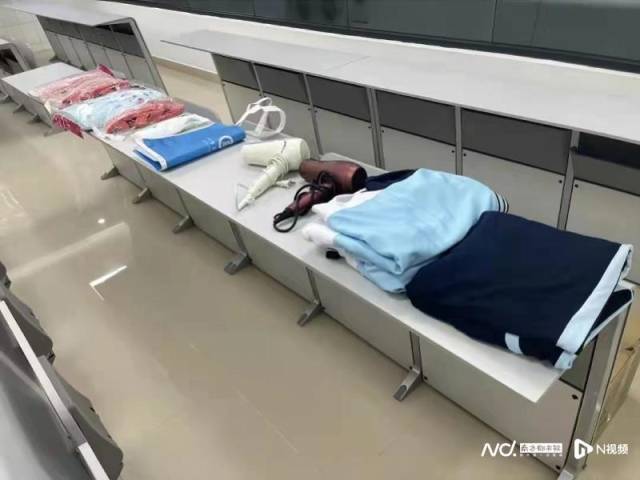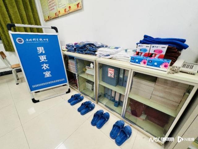 广州科学城中学考点为考生配置了应急物资,贴心地按男女款式安排了拖鞋、设置男女更衣室,校服、毛巾、电吹风等应急必需物品。