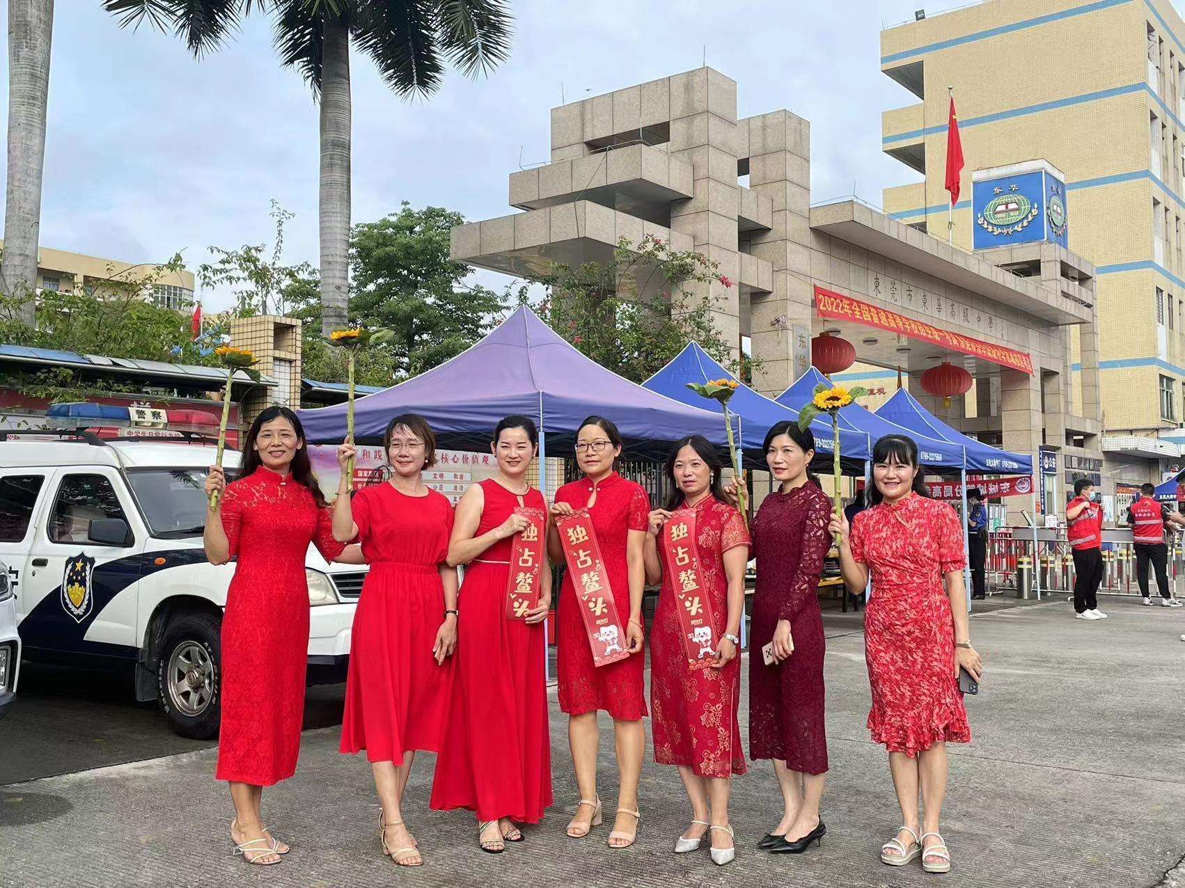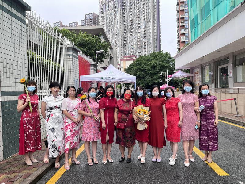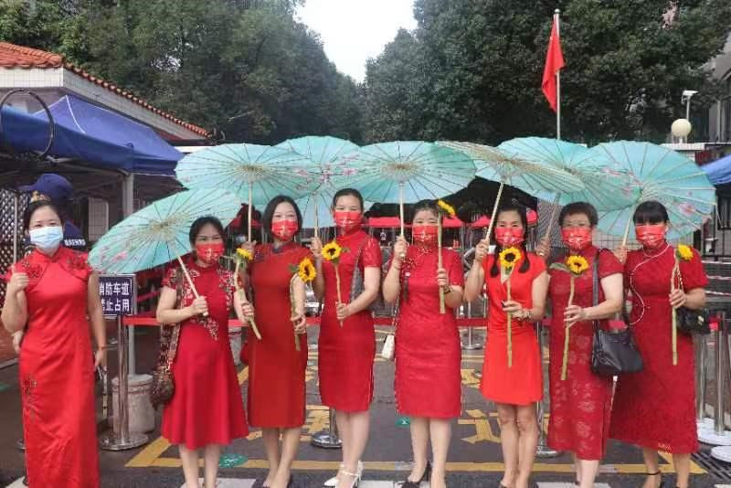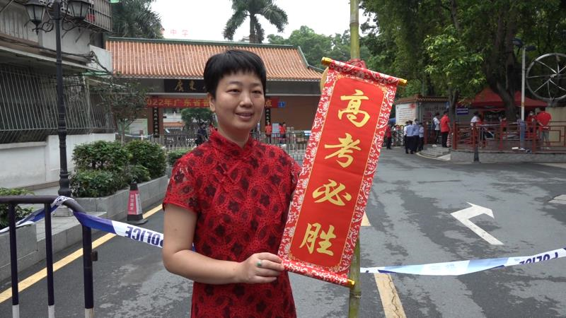 ▲【东莞·东华高级中学】考生家长身着旗袍为考生加油打气。