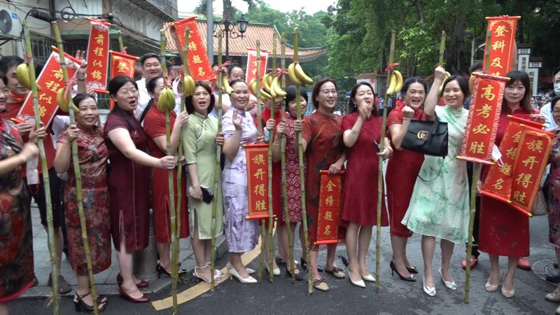 ▲广州市广雅中学考点门口,考生家长们身穿艳丽旗袍,手拿甘蔗、香蕉和红色卷轴,齐喊“旗开得胜,掂过碌蔗”口号,为考生送去鼓励和祝福。