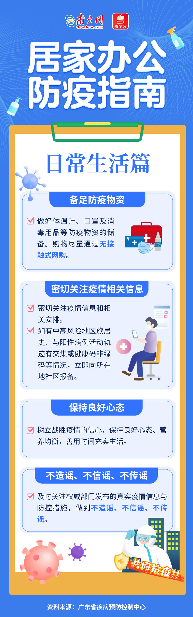 近期,国内本土疫情仍呈现多点散发、多地频发的态势,广东省多地接连报告本地新冠肺炎确诊病例。为降低疫情传播风险,我省部分地区陆续提出居家办公的倡议。居家办公期间,防疫要注意些什么?如何做好个人防护?这份居家防疫指南请收下!