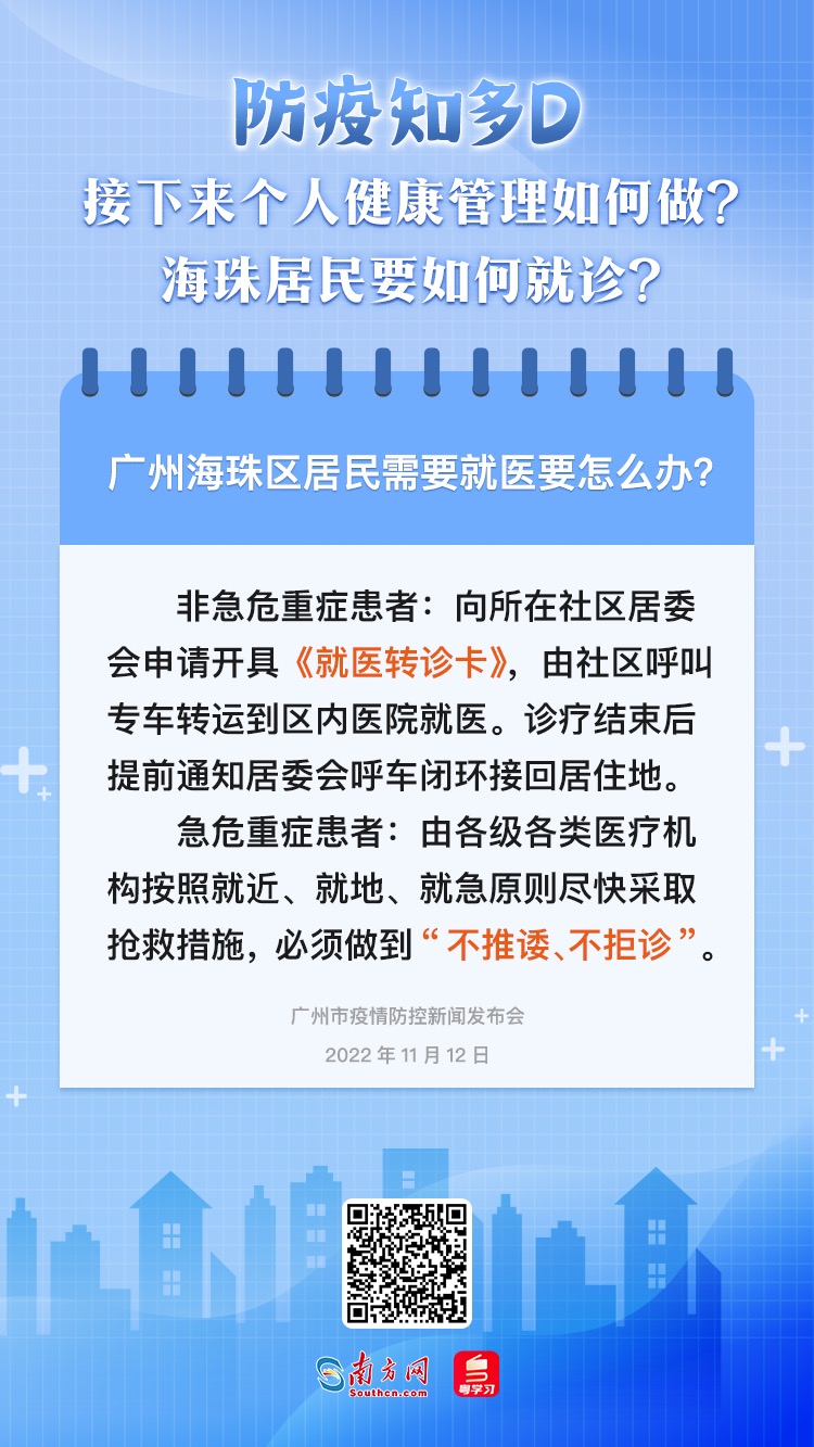 据了解,目前广州多区联动对控制疫情的跨区渗透起到了积极效果,但全市的疫情形势依然严峻,天河、越秀区的实时传播指数(Rt)在趋稳后,近期有所回升。对于国务院联防联控机制11日公布的进一步优化疫情防控的二十条措施,是否意味着市民就可放松个人健康管理?对于身处广州海珠区的居民,遇到就诊需求,又该怎么办?以下海报为你解答。