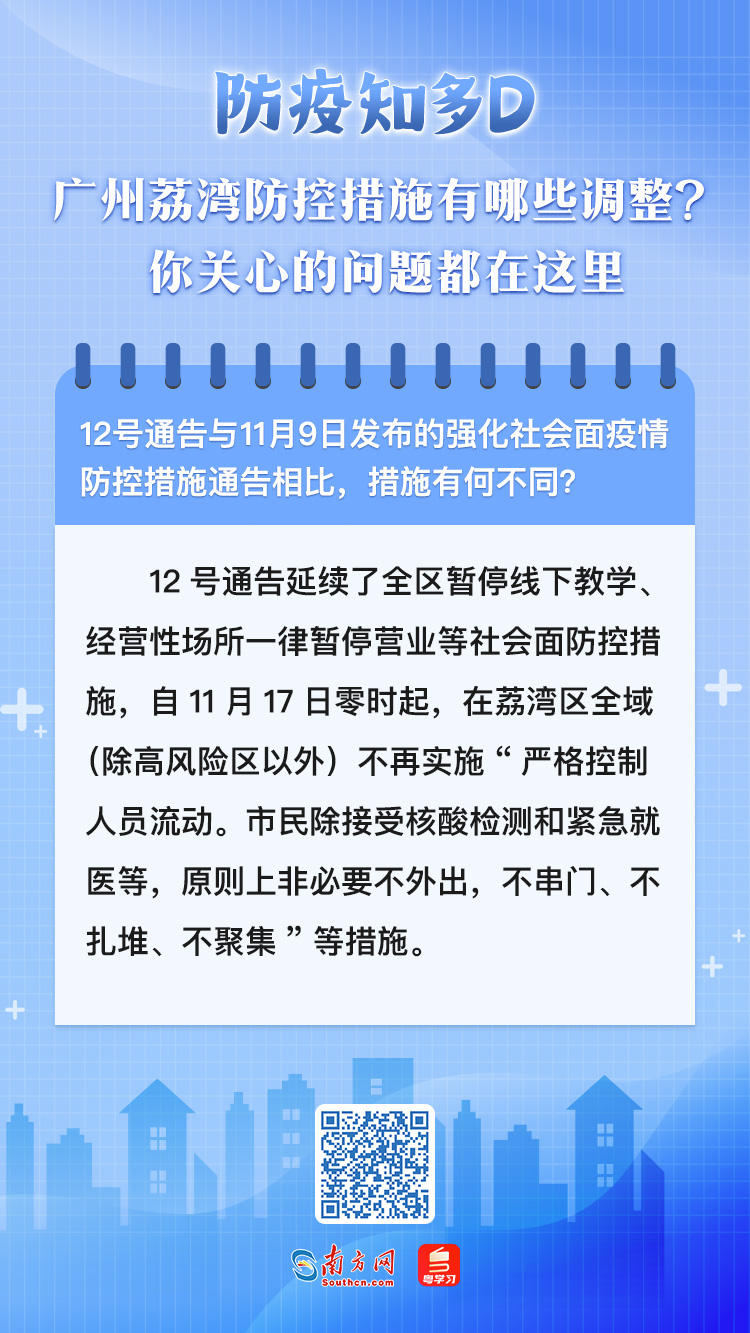 11月16日晚,广州市荔湾区新型冠状病毒肺炎疫情防控指挥部办公室发布《关于调整社会面疫情防控措施的通告(第12号)》(简称“12号通告”),自11月17日零时起,除高风险区以外,在荔湾区全域实行加强社会面管理等防控措施。目前,荔湾区市民能否正常上班上学?私家车能否上路?以下海报为你解答↓