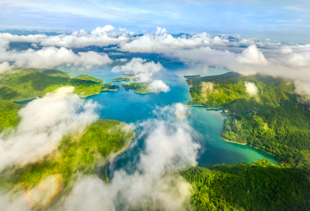 南水湖是广东省第三大人工水库、国家湿地公园。湖形呈带状,湖中数个岛屿,水质晶莹透碧,沿岸青山连绵,瑶寨竹木楼掩映在绿树丛中。看湖水深蓝碧玉,水面浩瀚,看湖光山色,倒影重峦叠嶂,如入水墨画中,沿途美不胜收。环湖自驾需1.5小时。