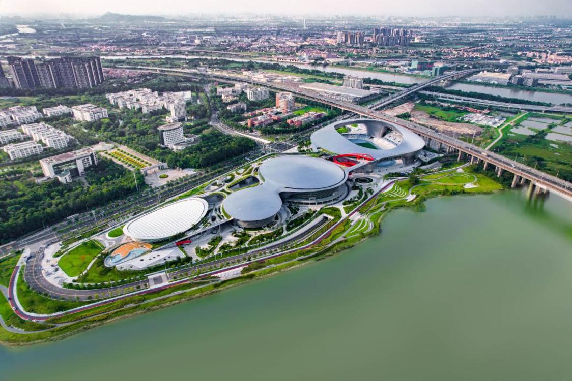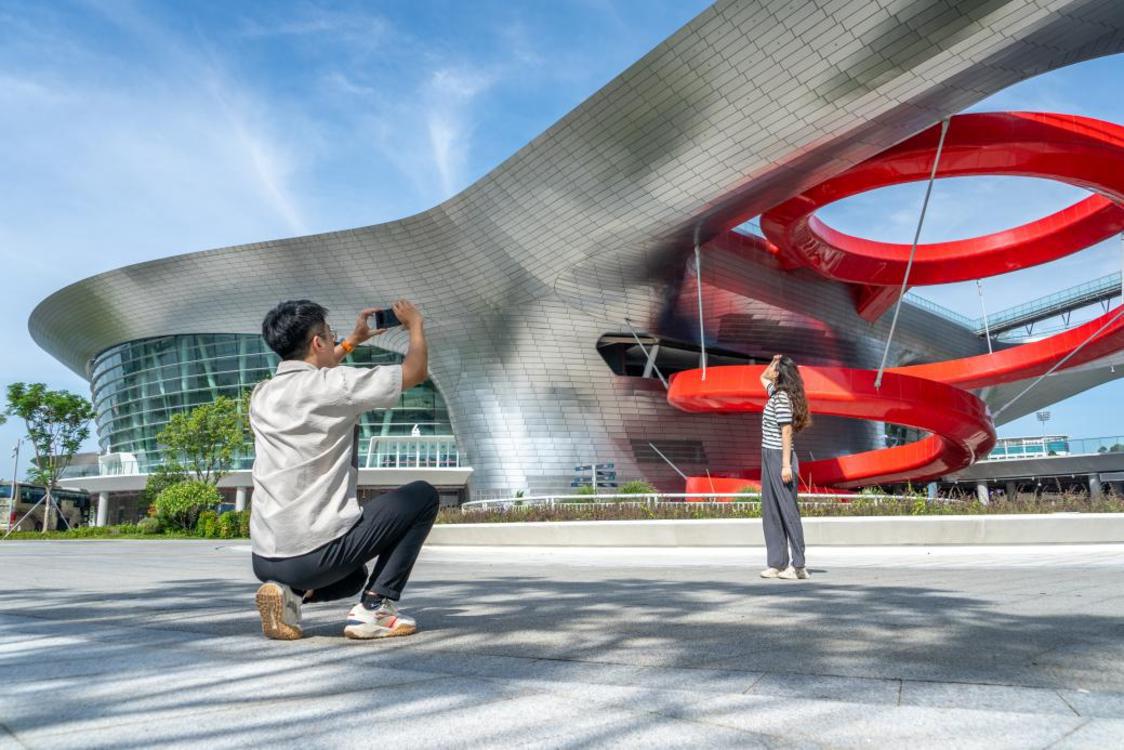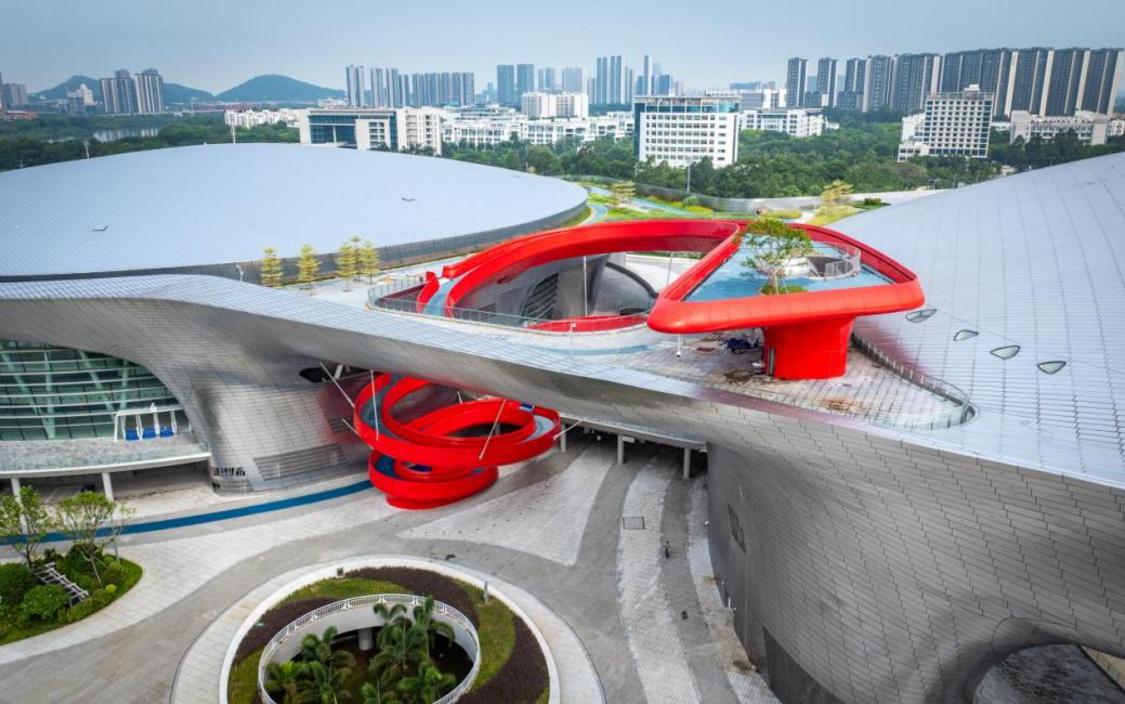 最引人注目的是被称为“赤龙凌空”的红色螺旋跑道。它总长近百米,设计灵感源自岭南醒龙文化,盘旋上升至33.6米高空观景台,从这里俯瞰,德胜河、顺德大桥及城市风光尽收眼底,这里也成为游客拍照留念的打卡点。
