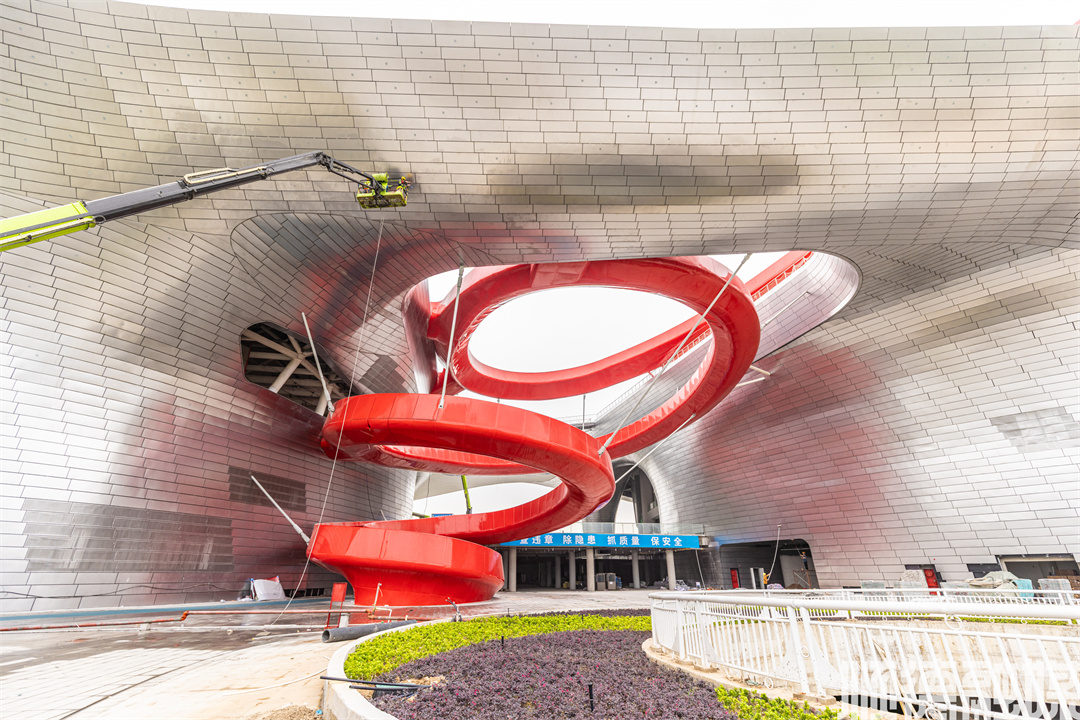 德胜体育中心最引人注目的,莫过于一个名为赤龙凌空的建筑设计,这是一个红色的螺旋坡道。