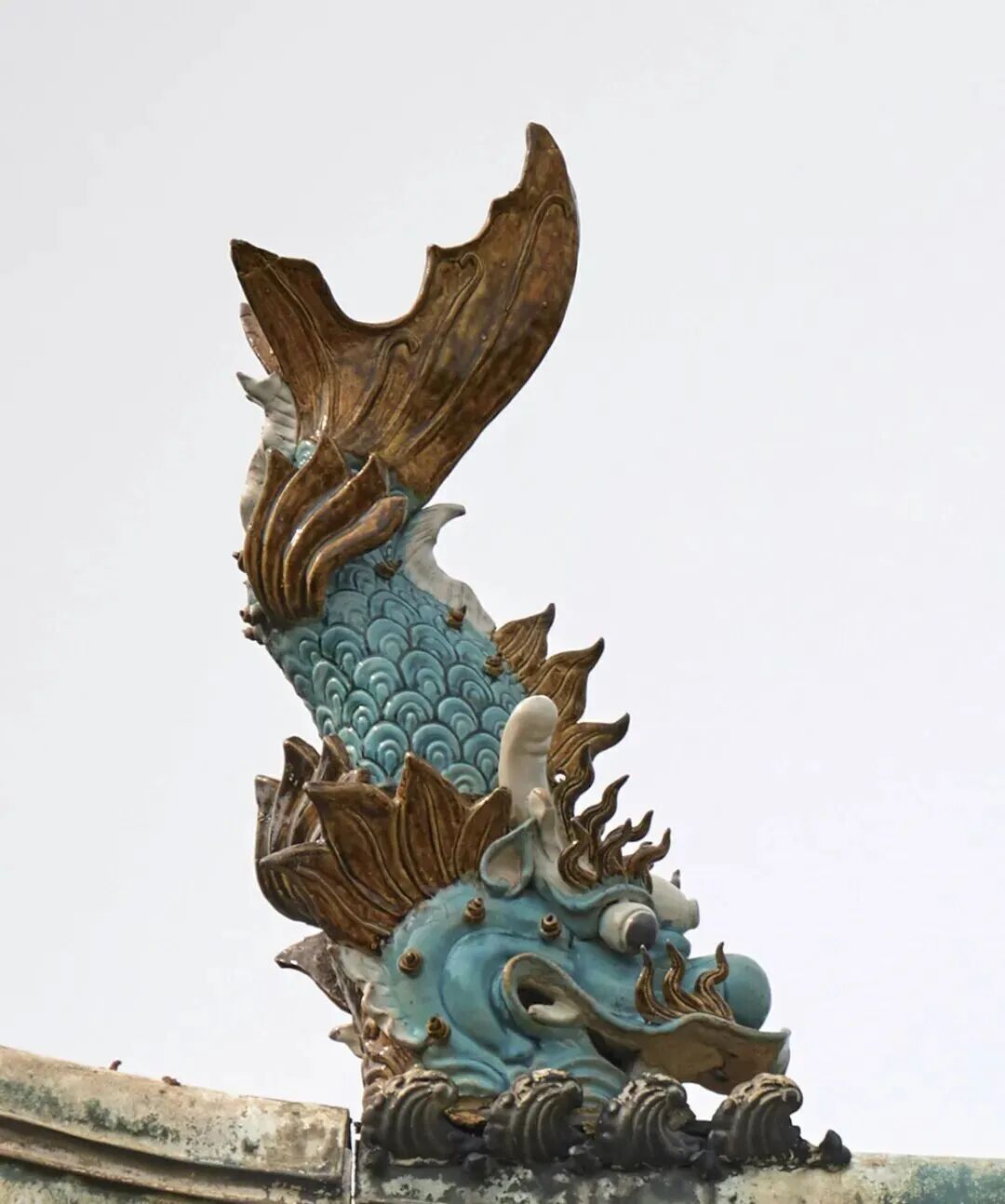 明代始建的丰宁寺,鳌鱼则呈 “新旧交融” 之美:大殿正脊的明代鳌鱼青灰古朴,侧脊1990年代补充的鳌鱼灵动鲜艳。“鳌鱼被信众赋予‘守护佛法’意义,修缮时会优先保护。” 寺内僧人释永明表示,2018年曾为受损鱼鳍按原工艺修复。