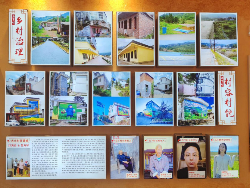 近年来,乘着“百千万工程”的东风,石下村的乡村治理和村容村貌发生了翻天覆地的变化。曾经房前屋后乱堆的杂物被清理一空,村民住宅的外墙绘上了展现乡土风情和红色文化的彩绘,与远处层叠的梯田相映成趣,构成一幅美丽的现代乡村画卷。