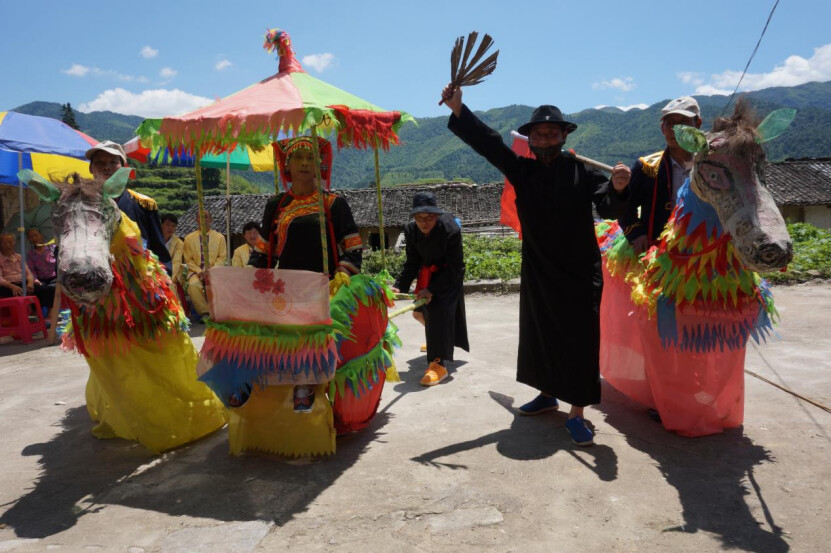 (乐昌五山平和村纸马队由一旗手、两马童、一驼背推轿表演)