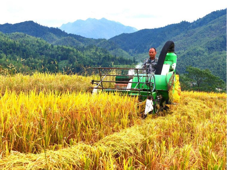 (2025年11月,村民在石下村上黎组梯田采收稻谷)