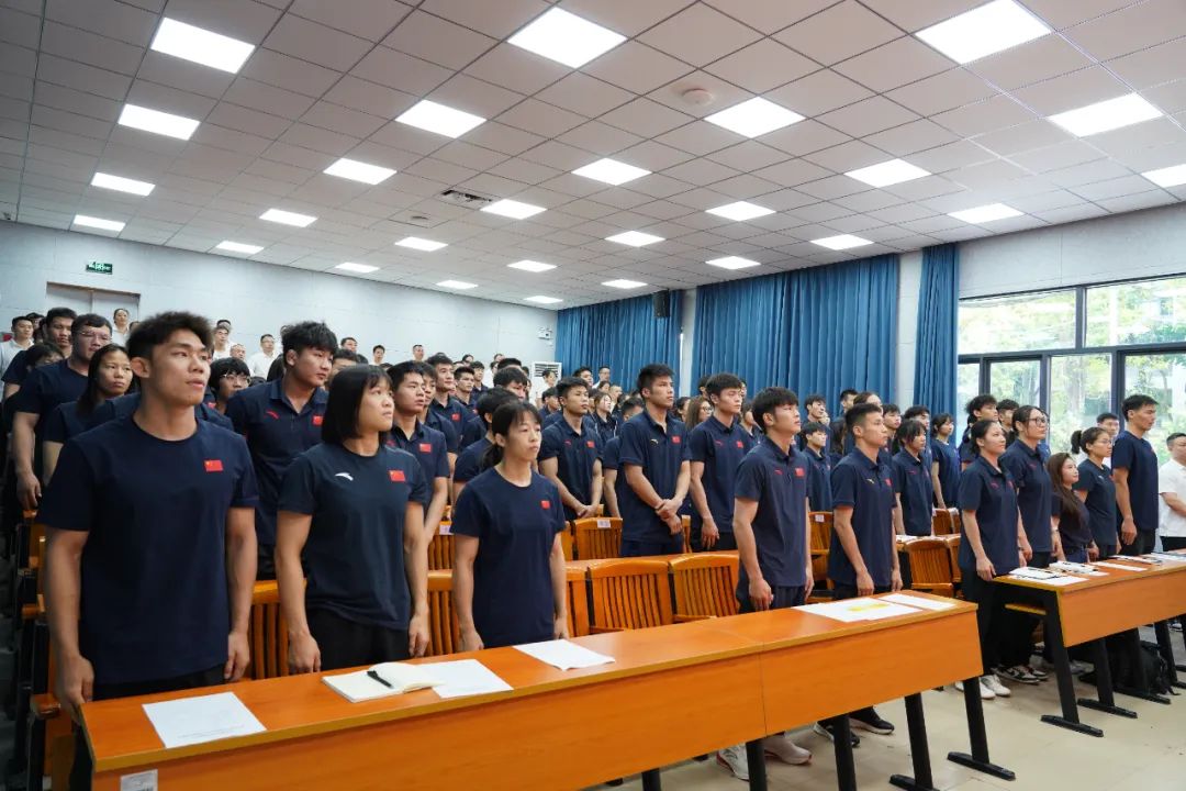 在跳水运动员谢思埸的带领下,全体运动员共同进行宣誓:秉承“敢于拼、善于战、勇于胜”的广东体育军团精神,在十五运会赛场上团结协作、顽强拼搏、奋勇争先,以青春之名亮剑全运,再创二沙新辉煌!