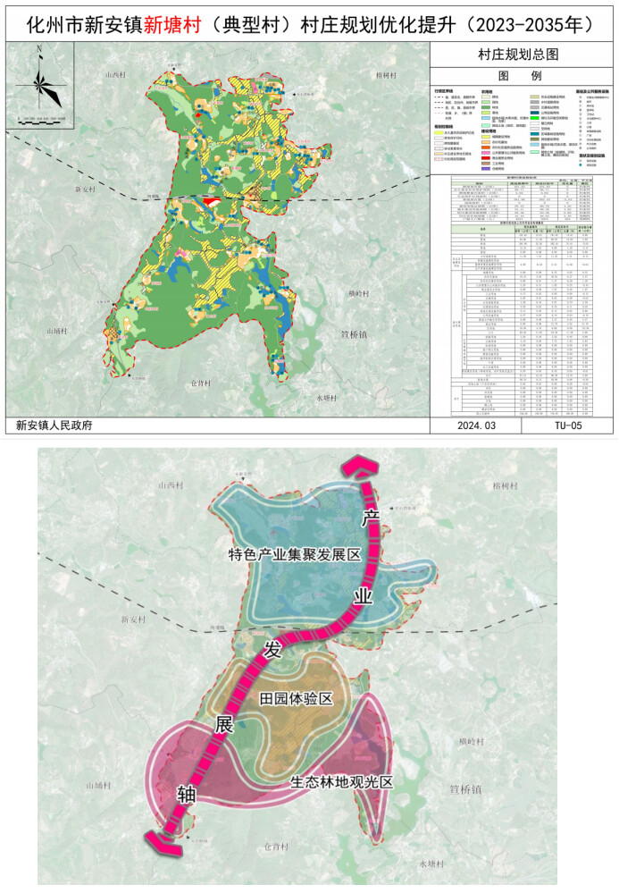 3、规划引领未来:编制《化州市新安镇新塘村(典型村)村庄规划优化提升(2023—2035年)》,谋划27个项目,涵盖产业发展、设施配套、人居环境等领域,布局特色产业集聚发展区、田园体验区、生态林地观光区。