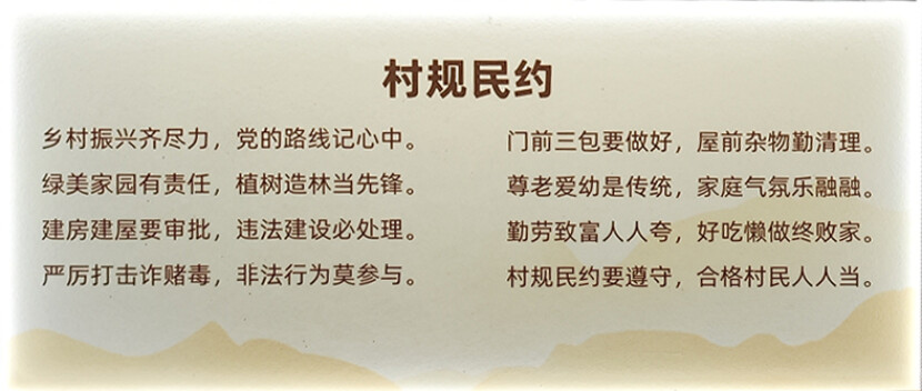 3、村规民约:明确“乡村振兴齐尽”“绿美家园有任”“尊老爱幼是传统”等规范,倡导勤劳致富、遵纪守法,培育文明乡风、良好家风、淳朴民风。