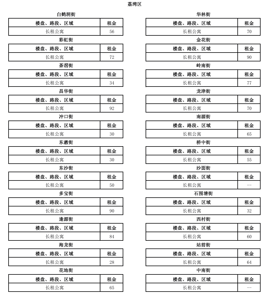 广州市房屋租金参考价范围覆盖广州市11个行政区,包括荔湾区、越秀区、天河区、海珠区、白云区、黄埔区、番禺区、南沙区、增城区、花都区和从化区。