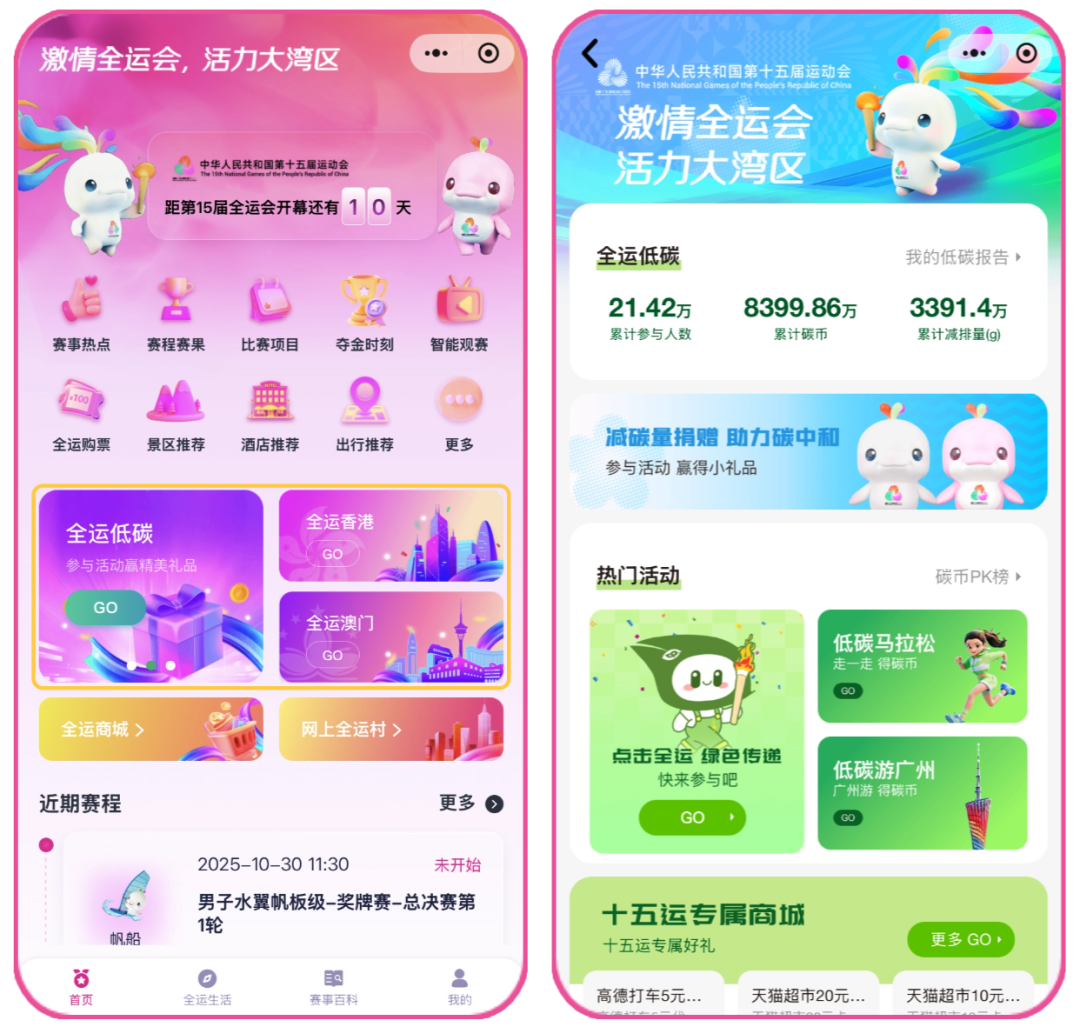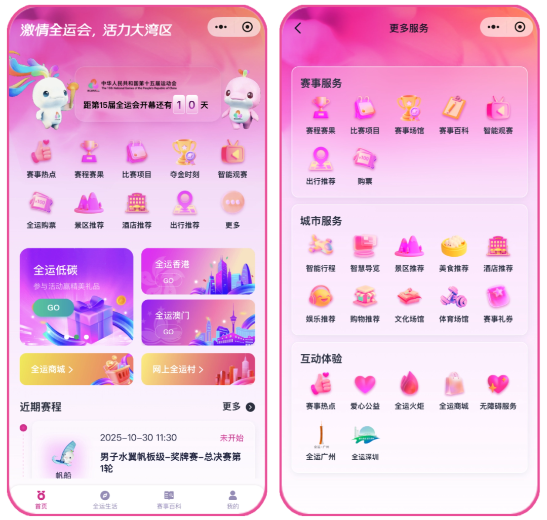 近日,十五运会广东赛区执委会、残特奥会广东赛区执委会正式上线官方综合服务平台——“粤港澳全运通”小程序。这款集赛事服务、城市导览、互动体验于一体的数字化工具,打通了“看比赛”和“逛湾区”的双重需求,让来自全国各地的观众、游客,通过微信或支付宝即可轻松使用,实现赛事实时查、湾区观光游、三地服务通,畅享全运精彩与岭南魅力。