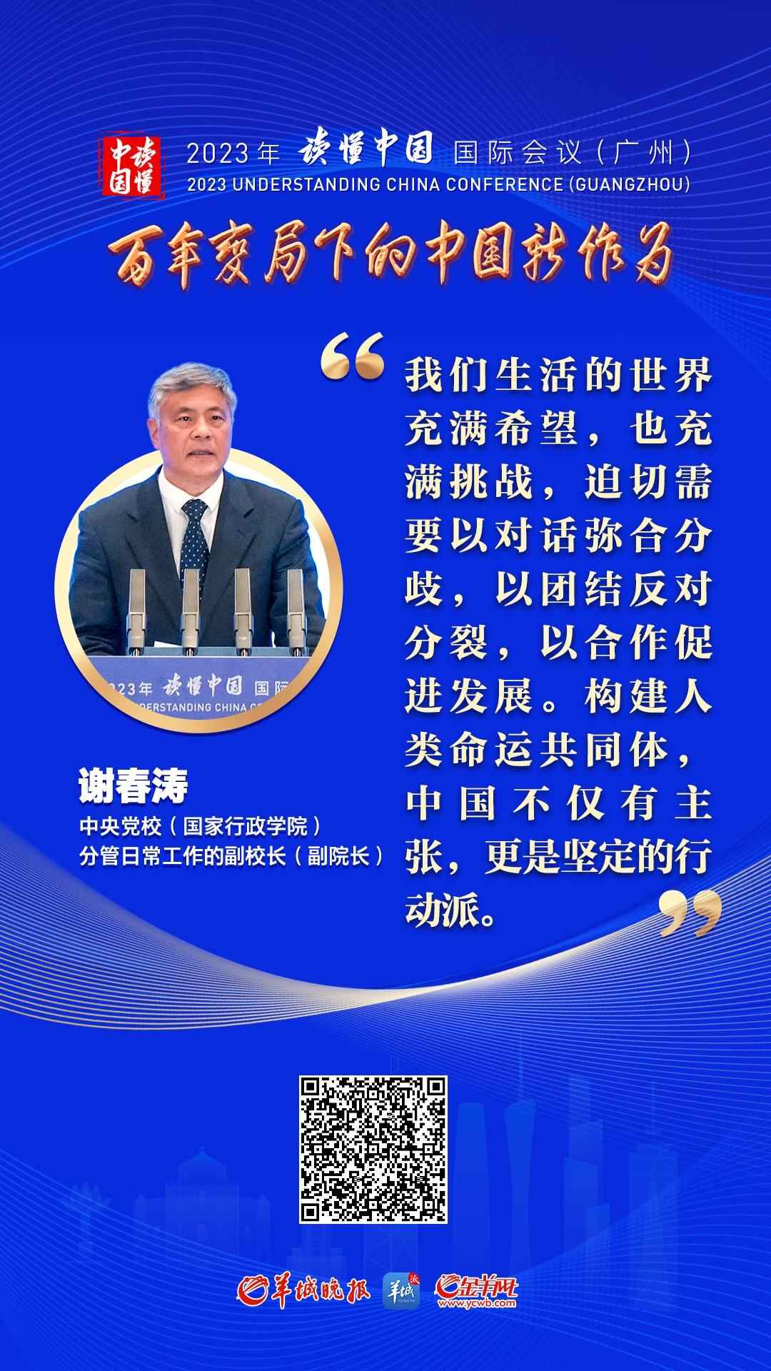 12月2日上午,2023年“读懂中国”国际会议(广州)在越秀国际会议中心开幕,在开幕式上的大会演讲环节,中央党校(国家行政学院)分管日常工作的副校长(副院长)谢春涛,以“为共创美好世界贡献中国方案”为主题进行分享。