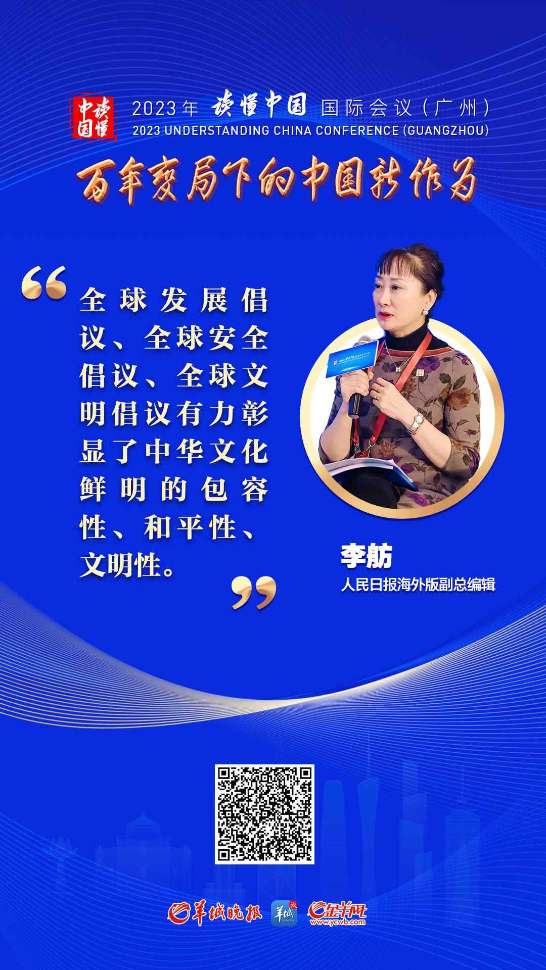 12月2日,2023年“读懂中国”国际会议(广州)“专题会议三:全球文明倡议与文明交流互鉴”上,人民日报海外版副总编辑李舫表示,全球发展倡议、全球安全倡议、全球文明倡议有力彰显了中华文化鲜明的包容性、和平性、文明性。
