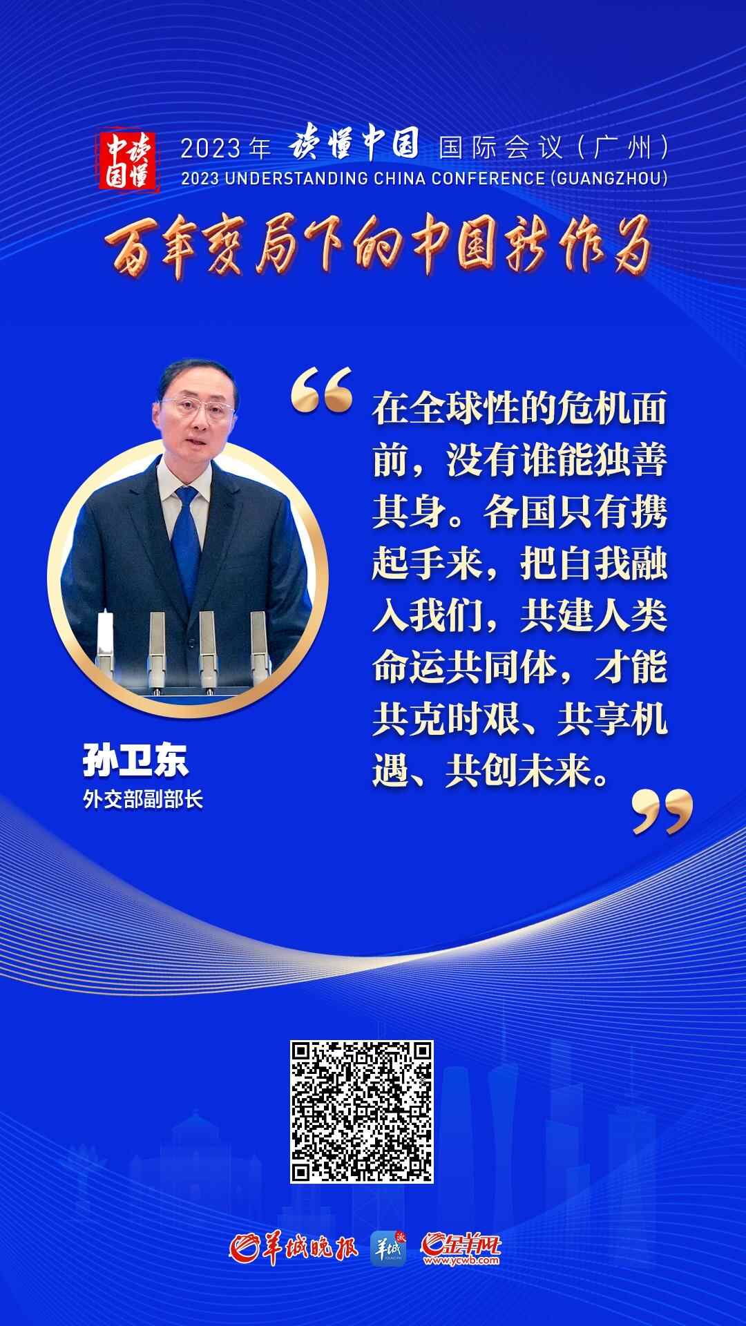 12月2日上午,2023年“读懂中国”国际会议(广州)在越秀国际会议中心开幕。在开幕式上的大会演讲环节,外交部副部长孙卫东从四个方面深入阐述“要读懂中国特色大国外交就需要读懂人类命运共同体”理念的内涵和意义。