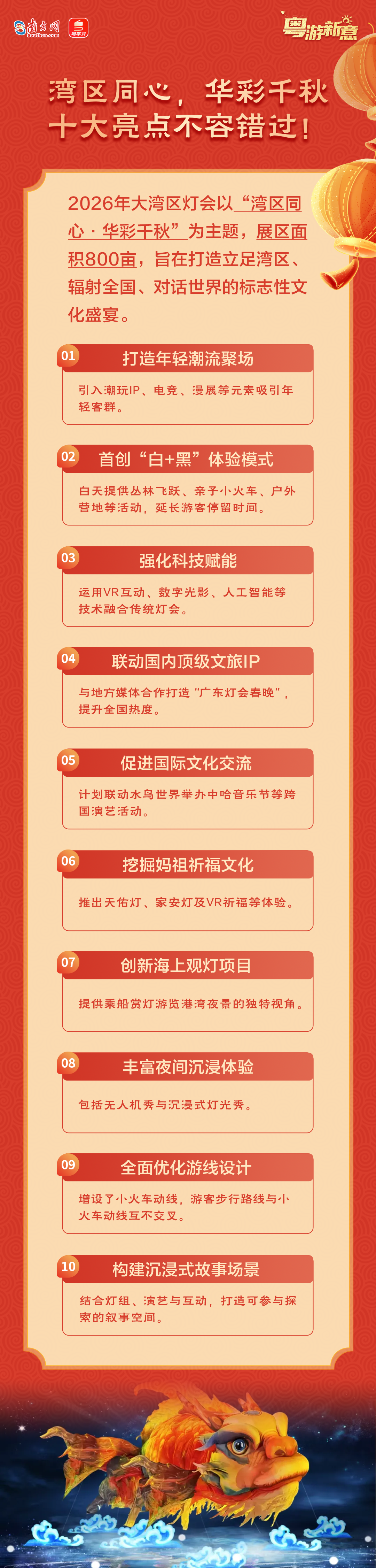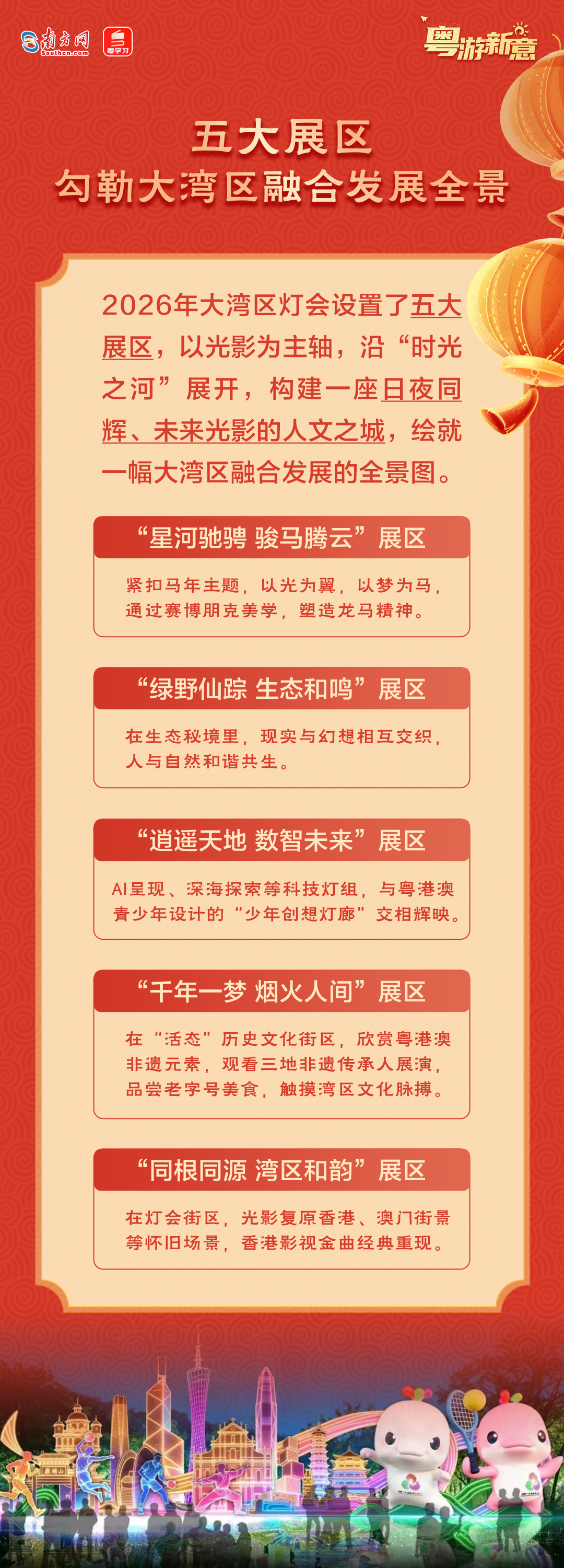 与去年相比,2026年大湾区灯会将新增光影秀,同时十五运会吉祥物“喜洋洋”“乐融融”,中国上古神话中的鳌鱼等元素将亮相灯会。本届灯会还有哪些特色亮点?一组海报带你了解。