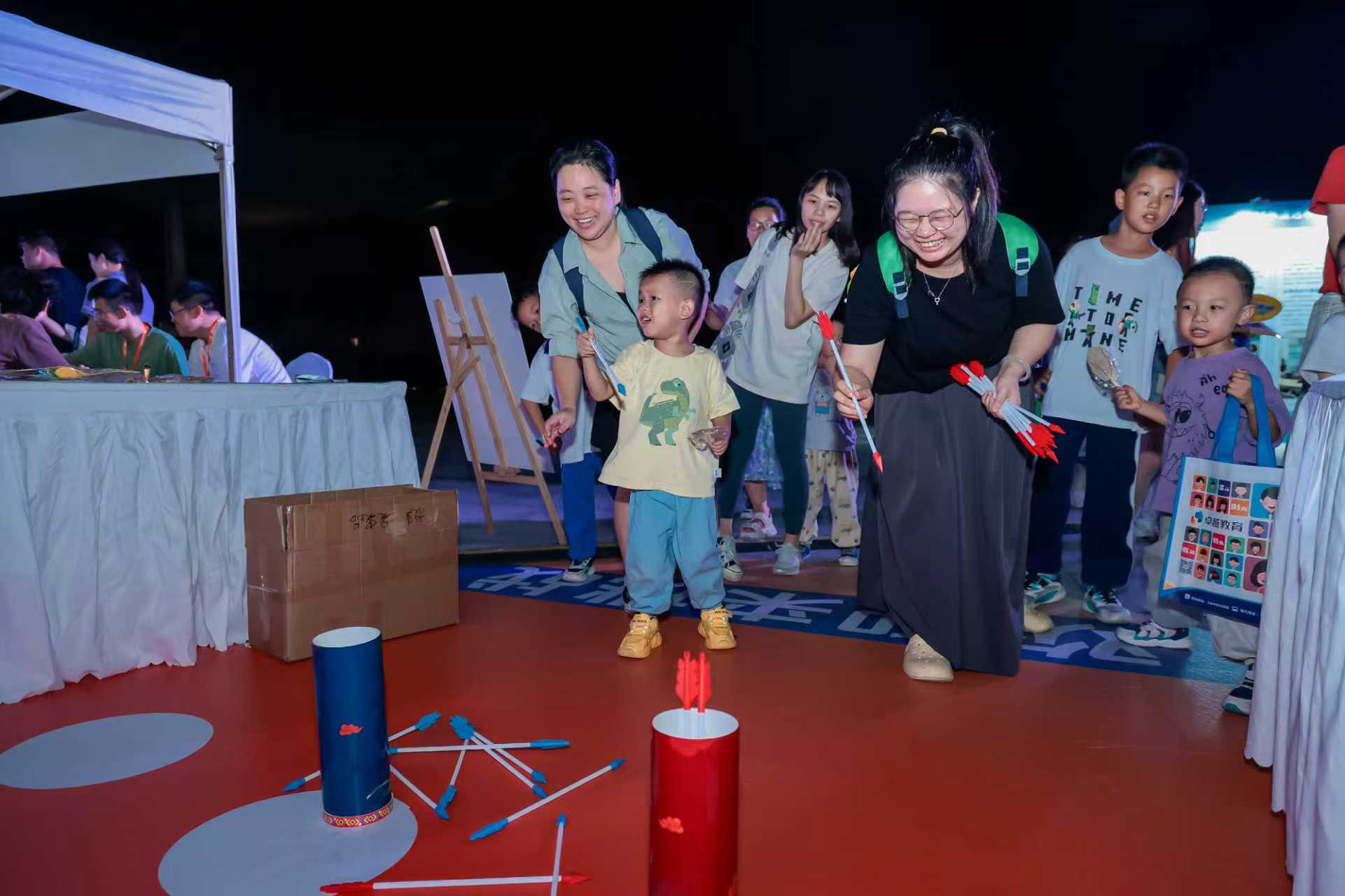 科普夜市现场设置探索科学奇妙夜互动区,设置古今技艺解析、传统游戏科学探秘、古为今用科技体验三大板块。运用前沿技术拆解传统的造纸术、活字印刷术的制作原理,材料运用等,结合投壶游戏,激发观众对科学的探索热情,让观众能够在互动体验中了解传统文化,学习到古代技艺中的科学知识。