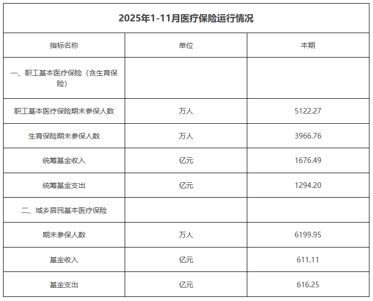广东省2025年1—11月医疗保险和生育保险运行情况