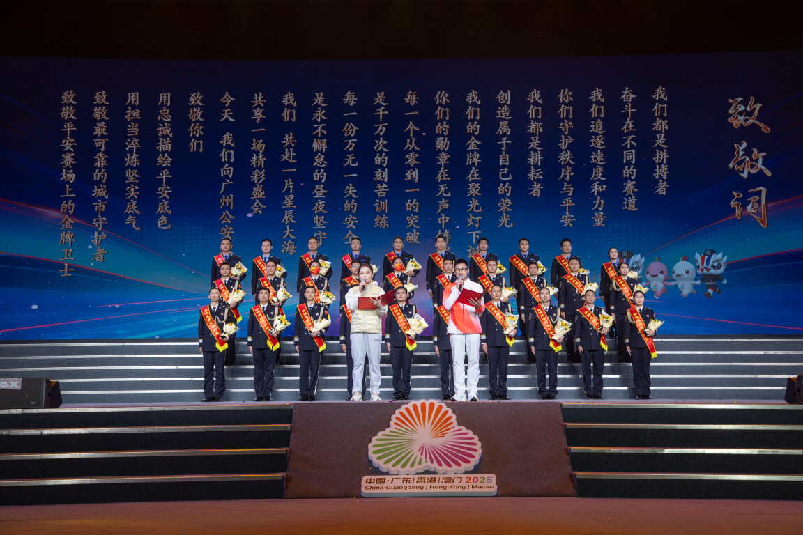 活动现场,十五运会男子水球冠军队成员高英倚、十五运会体操青年组女子团队成员梁雅婷,以及志愿者代表,佛山、韶关、惠州、东莞、中山、清远等6地市公安民警代表登台,共同点赞全运安保工作。随后,全场观众唱响《海阔天空》《真心英雄》,运动健儿的拼搏精神与警队的忠诚奉献同频共振。在致敬仪式环节,雅典奥运会跳水冠军、十五运会广州站首棒火炬手杨景辉,巴黎奥运会羽毛球冠军陈清晨宣读致敬词,向安保工作中表现突出的集体和个人代表致以敬意。
