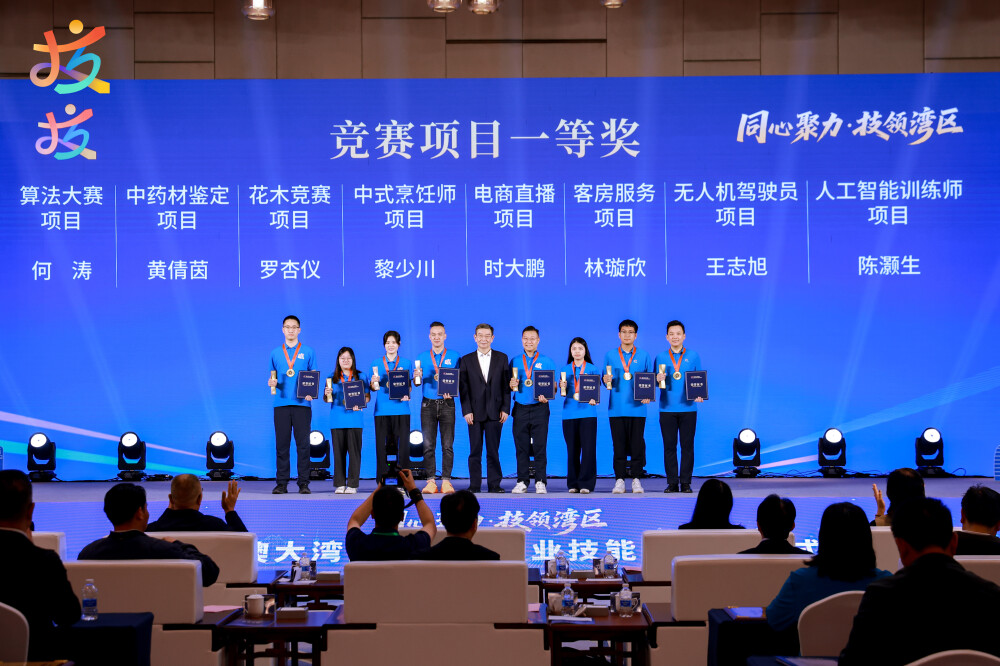 颁奖环节将现场气氛推向高潮。大赛结果名单由无人机以科技感十足的方式送达现场。香港工会联合会、澳门工会联合总会等单位获得卓越组织奖,广州市总工会等获得团体奖,陈楚娟等7人获得湾区风采奖,王志旭等80名选手分别获得算法大赛、中药材鉴定、花木竞赛、中式烹饪师、电商直播、客房服务、无人机驾驶员、人工智能训练师等八大项目的个人一、二、三等奖。
