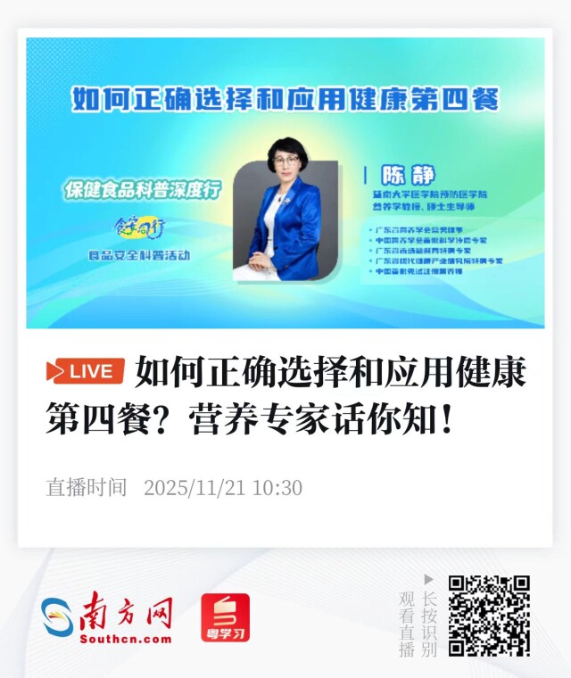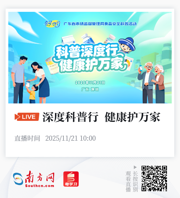 “保健食品”“特殊医学用途配方食品”“婴幼儿配方食品”这些特殊食品如何选购才放心?11月21日上午10:00-12:00,国家市场监督管理总局“保健食品科普深度行”活动携手广东省“食安同行”科普活动来到深圳市食品药品科普教育基地,教你看清标签标识、按需选购,避开消费陷阱,学会理性消费。这场干货满满的特殊食品知识科普,邀你一起守护家人饮食安全,快来参与吧!