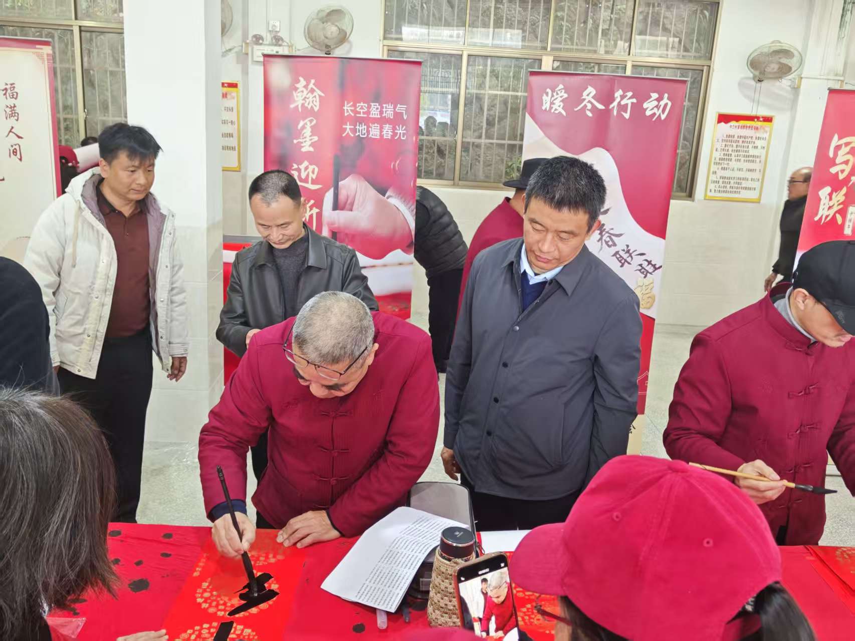 闻讯赶来的村民们围站在案几旁,或踮脚驻足观赏书法家创作,或轻声交流挑选心仪联句。拿到刚书写完成、还带着墨香的春联,村民们脸上满是喜悦,纷纷称赞:“这才是过年的喜庆热闹样子!”