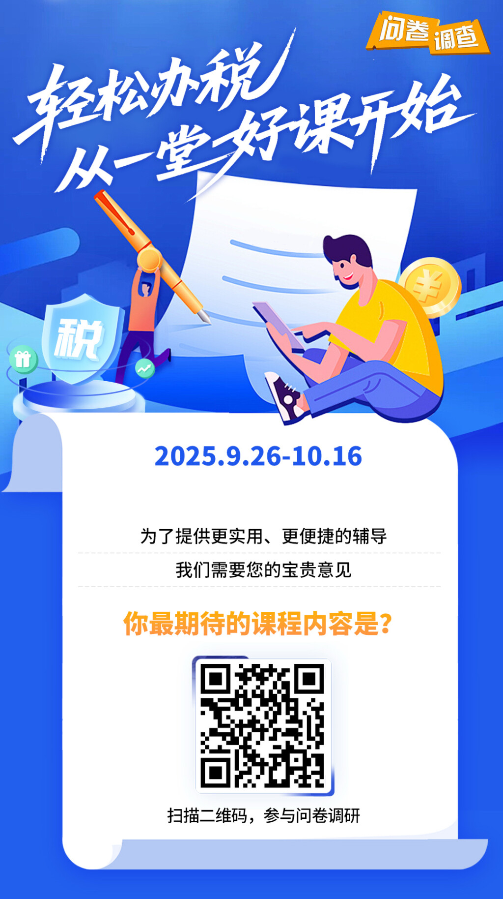 为确保课程内容紧密贴合实际需求,切实解决您在日常办税缴费中关注的重点与难点,我们精心设计了本次课程问卷调查,诚挚邀请您拨冗参与,就感兴趣的课程主题、内容形式、授课时长等方面提出宝贵意见。您的反馈至关重要!问卷所有信息将严格保密,仅用于课程研发目的。