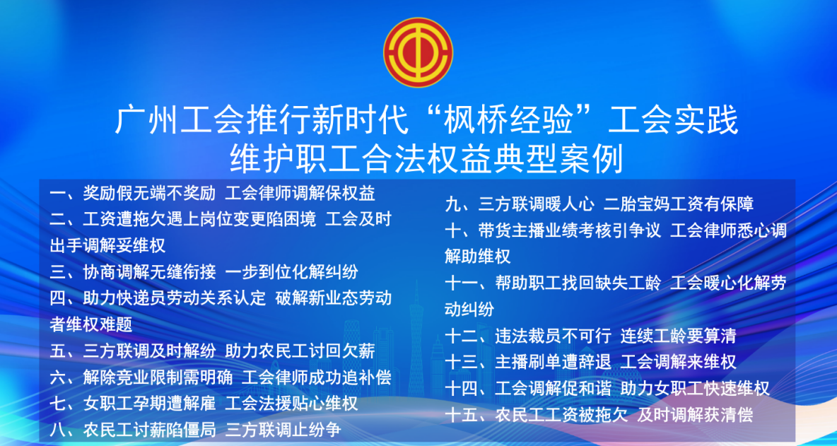 8月18日,广州市总工会正式成立第五期广州市工会法律服务律师团,为2024年度职工“金牌贴心人”、维护职工合法权益典型个人、市三方联合调解中心优秀调解员颁发证书,并发布2024年度广州工会维护职工合法权益典型案例。