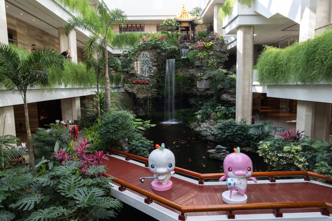 广轻控股集团专业景观设计制作团队在海心沙打造的大型彩扎吉祥物悬浮装置