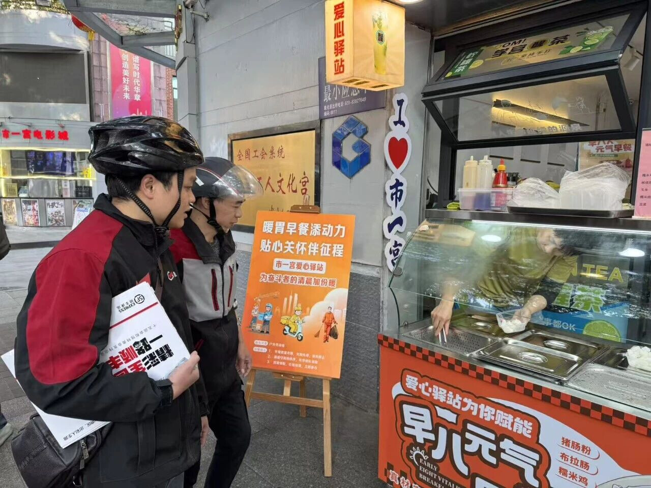刚送完早高峰订单的外卖骑手王先生,匆匆来到驿站歇脚,喝上一口热豆浆,驱散奔波的疲惫。“平时忙起来经常顾不上吃饭,工会驿站就像我们的‘避风港’,不仅能歇脚充电,还能领到暖心早餐,这种被惦记的感觉特别好。”