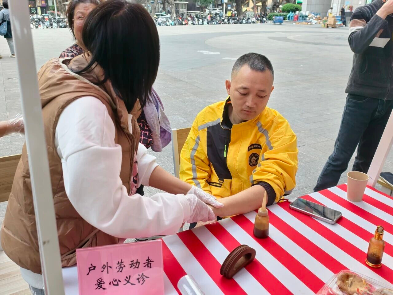 在第一次全国劳动大会旧址游客中心,广州市第二工人文化宫联合海幢街道党群服务中心为一线环卫工人送上热饮、牛奶、福字及祈福愿望签等暖心礼包。广州市第三工人文化宫工会驿站暖心行动现场则设立了爱心义诊服务点,为户外劳动者提供免费健康咨询。