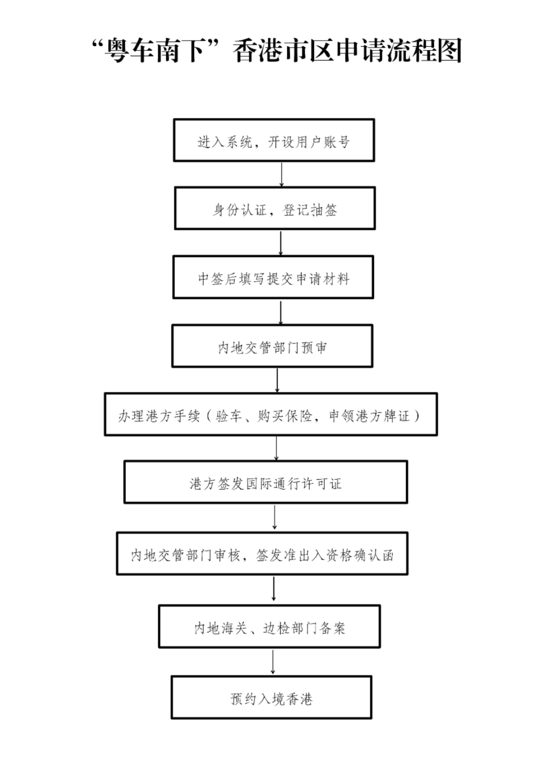 申请流程:申请人(机动车所有人)办理广东省机动车经港珠澳大桥珠海公路口岸入出香港业务,需要访问“粤车南下”信息管理服务系统(以下简称“粤车南下”信息系统,网址:https://ycnx.singlewindow.gd.cn)进行用户注册。咨询热线:020-95198。“粤车南下”信息系统服务时间为8时30分至22时30分。