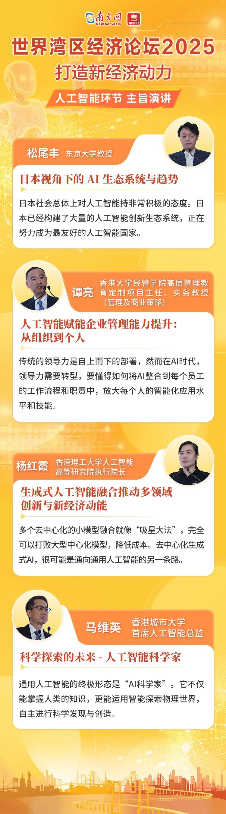 11月3日下午,世界湾区经济论坛2025人工智能分论坛在香港举行。来自全球的人工智能专家学者和行业代表通过一个个主旨演讲与深度分享,探讨了AI技术的前沿趋势与未来应用。以下海报,带你快速get到论坛精华↓
