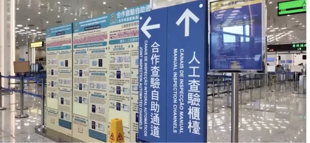 横琴口岸旅检大厅对通关模式做了全新升级,出入境旅客无须出示证件,可自助“刷脸”,随后通过核验指纹和面部特征,就可以完成琴澳两地的通关手续,跨境出行更加便捷和高效。图为横琴口岸的通过查验指引。