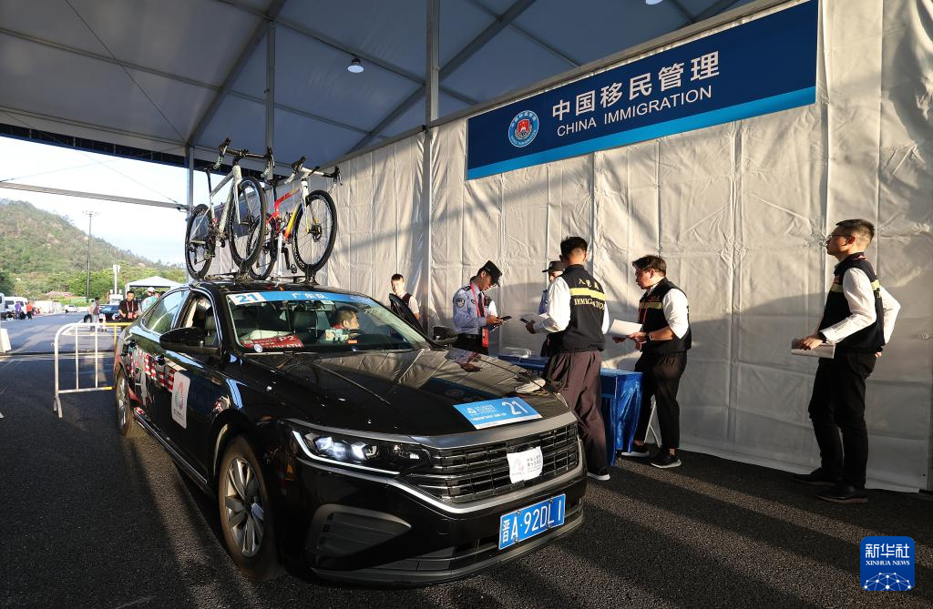 公路自行车赛涉赛车辆、物资都采用“前置查验+闭环管理”监管模式。参赛团队提前报审形成“白名单”,在运动队启动之前进行核检,确保涉赛车辆、物资能在三地畅通无阻。图为公路自行车男子个人赛参赛代表团在前置安检区安检。