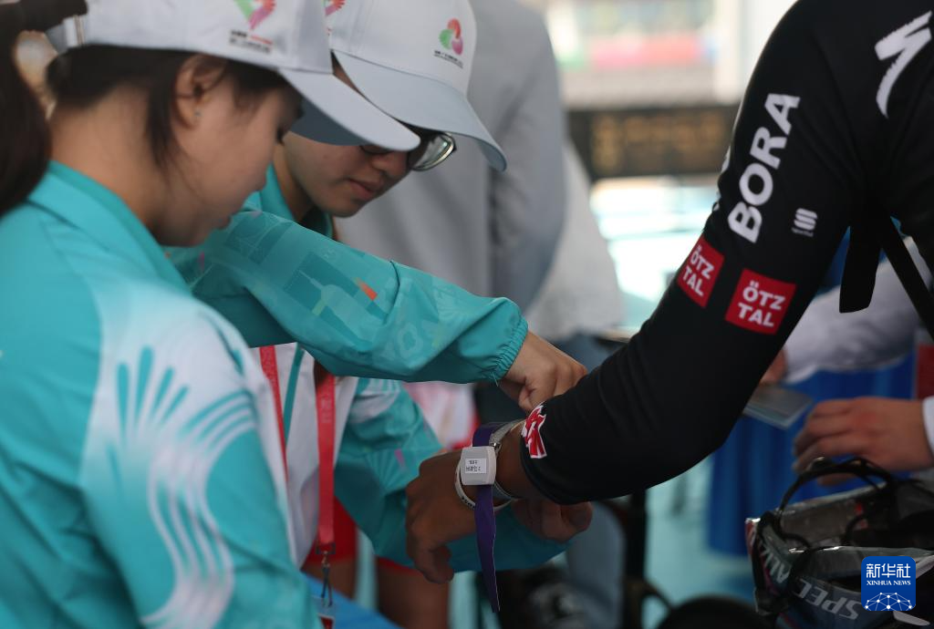 公路自行车赛道上的口岸区域安装了无线射频识别系统(RFID)。这套系统能在选手经过时自动读取车手与车的电子芯片,并即时回传到后台边检、海关系统进行同步核验,形成全程闭环管理。图为志愿者为公路自行车男子个人赛的参赛选手佩戴通关手环。