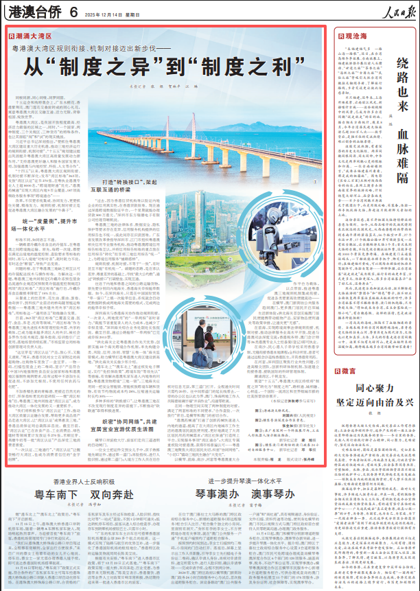 12月14日,《人民日报》以《从“制度之异”到“制度之利”》为题,重点报道关于大湾区规则衔接、机制对接的成果,以下为报道全文: